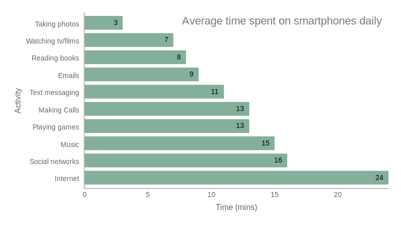 In the above chart, the vertical (y) axis are a set of categories of what tasks people do with their smartphones. The horizontal (x) axis is the minutes spent doing each task.